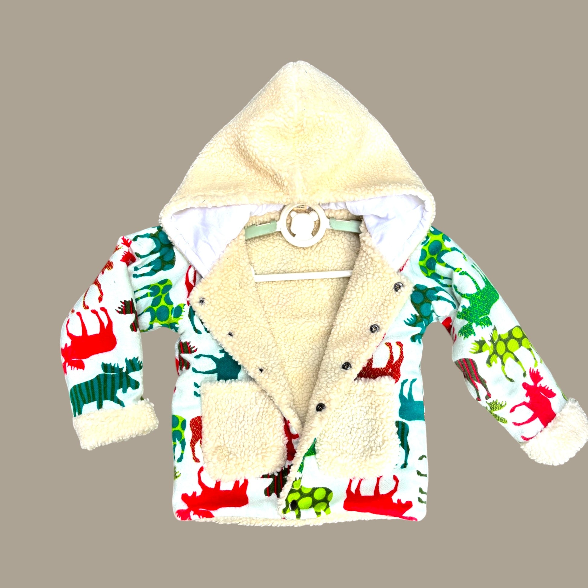 Keep your child snug and stylish with this adorable animal-print hooded jacket. Designed for warmth and comfort, it features a playful multicolored animal pattern that’s sure to delight. The fluffy sherpa lining adds extra coziness, making it perfect for chilly days.