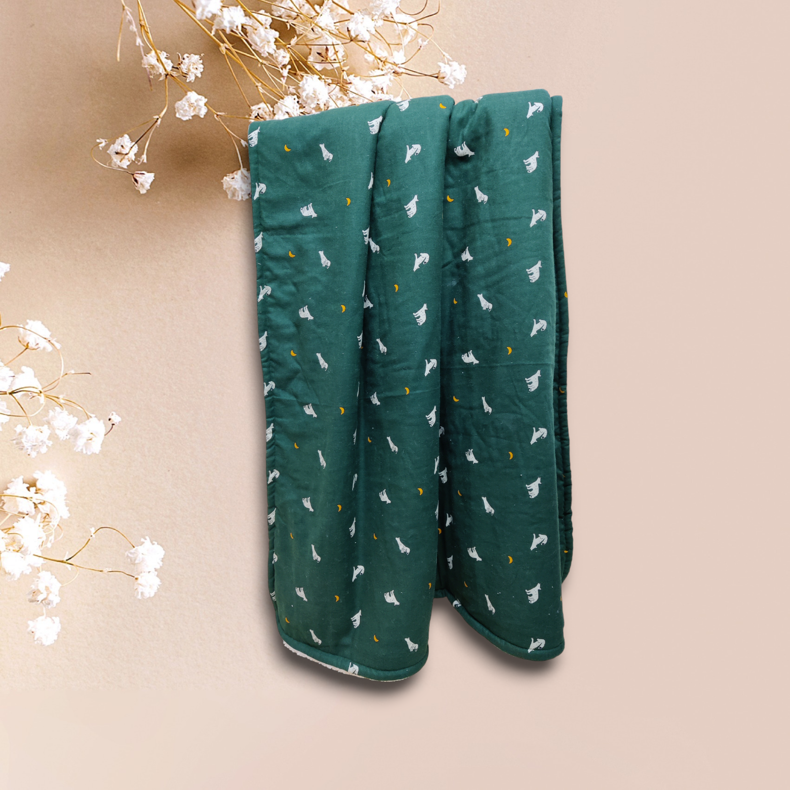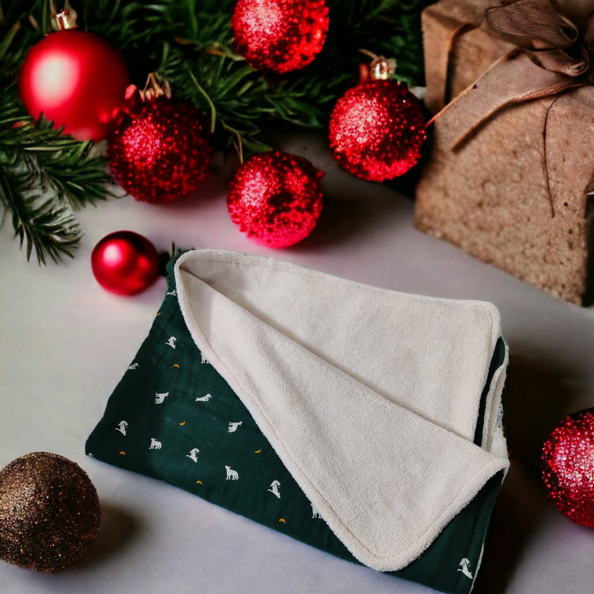 Introducing the Howling Wolf Toddler Blanket — a cozy, versatile blanket perfect for your little one’s bedtime, nap time, or cuddle time. Featuring a whimsical forest green design with playful howling wolves and crescent moons, this blanket sparks your toddler’s imagination while providing unparalleled comfort.