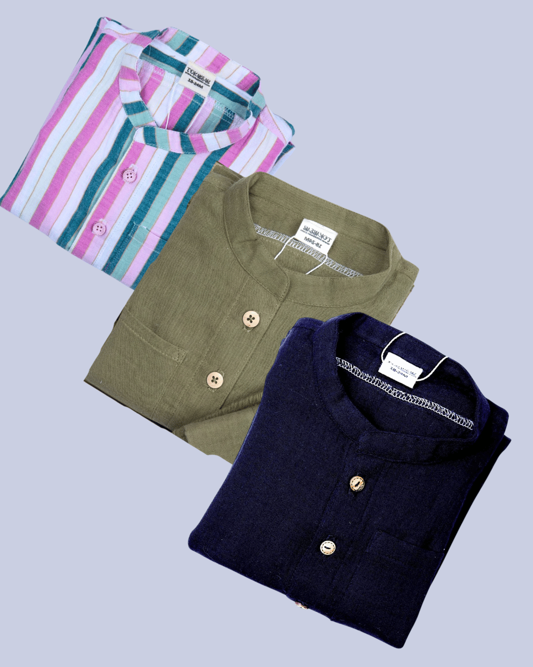 Featuring a timeless mandarin collar, charming wooden-look buttons, and roll-up sleeves, these shirts are designed to keep your baby comfy and looking sharp all day long. From everyday adventures to festive gatherings, this trio of soft grey, calming blue, and earthy rust blends comfort with effortless style.