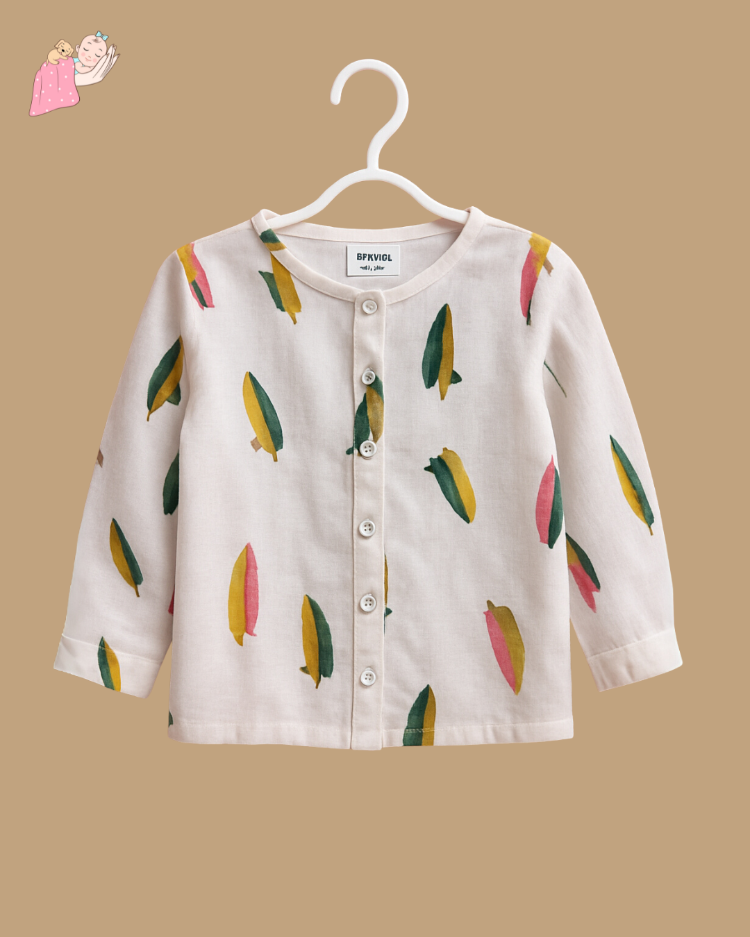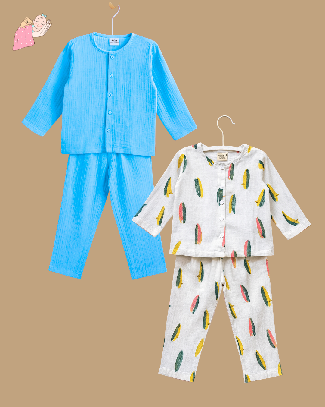 A playful surfboard-print night suit, in buttery soft muslin with front buttons, also designed without a collar to ensure zero discomfort
