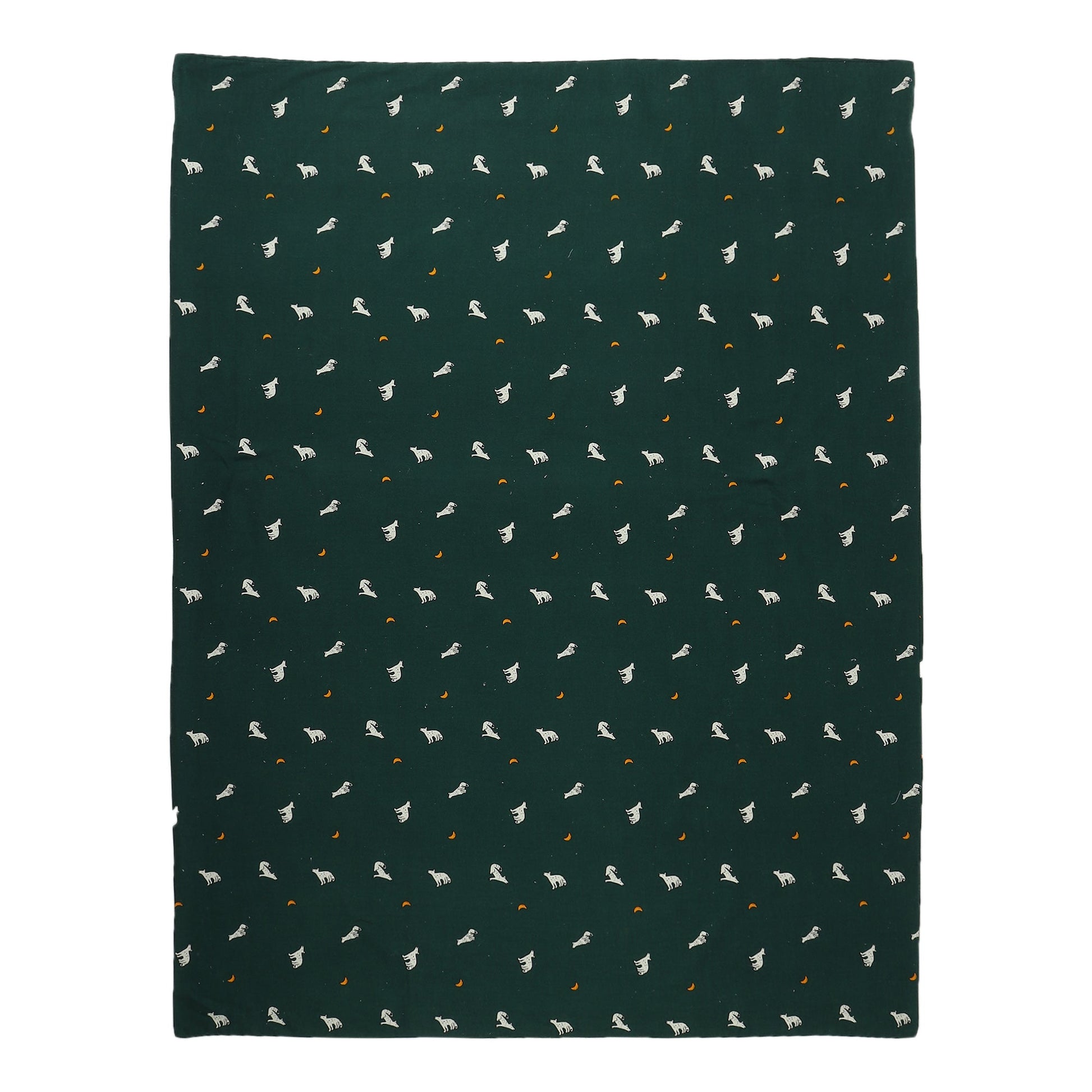 - Howling Wolf Cover: The comforter features a playful howling wolf pattern set against a deep forest green background, creating an adventurous yet soothing atmosphere. The wolves and small crescent moons scattered across the fabric add a whimsical touch, perfect for your little one’s sleep space. Made from soft cotton, the cover is both durable and easy to clean.