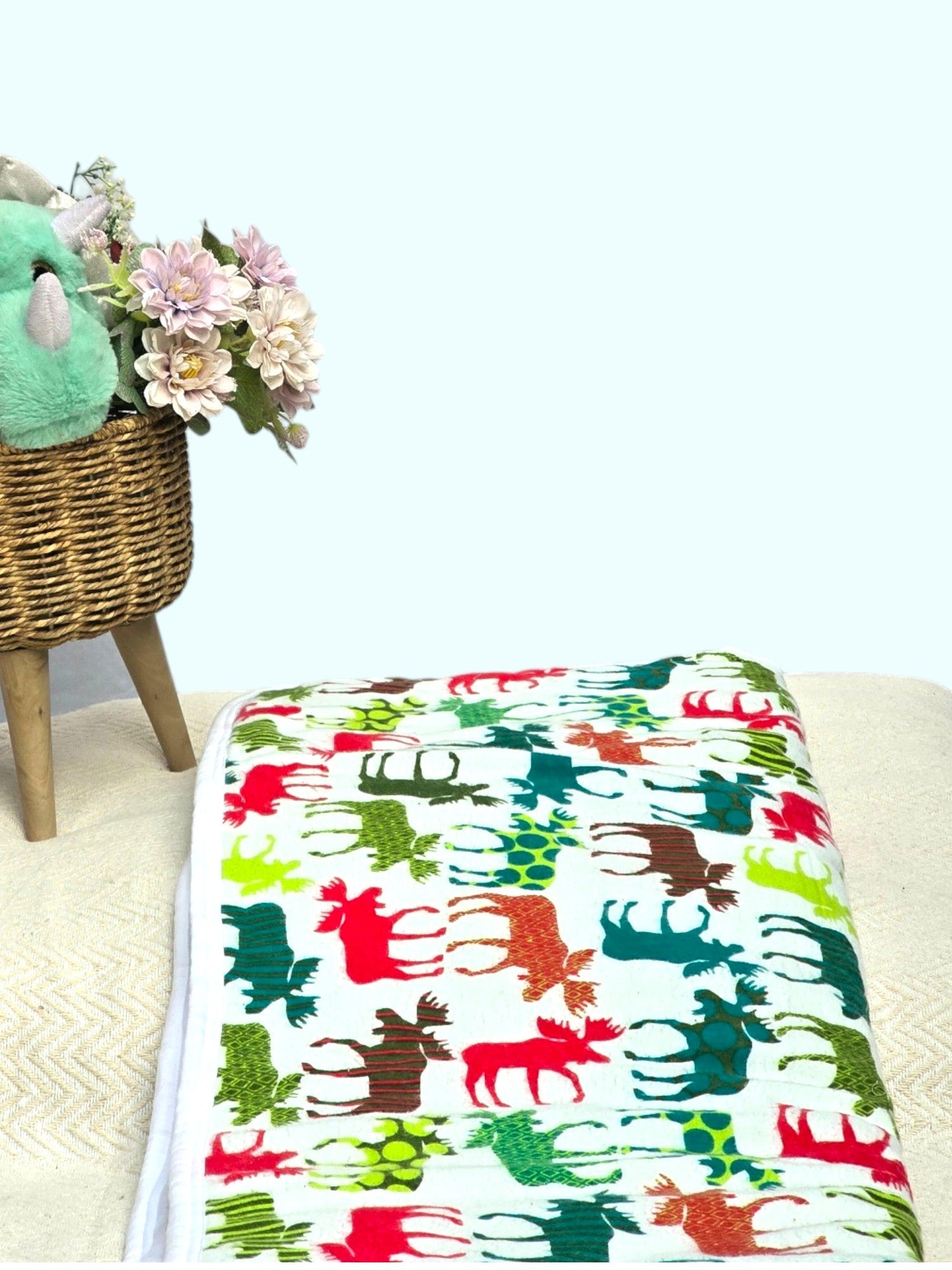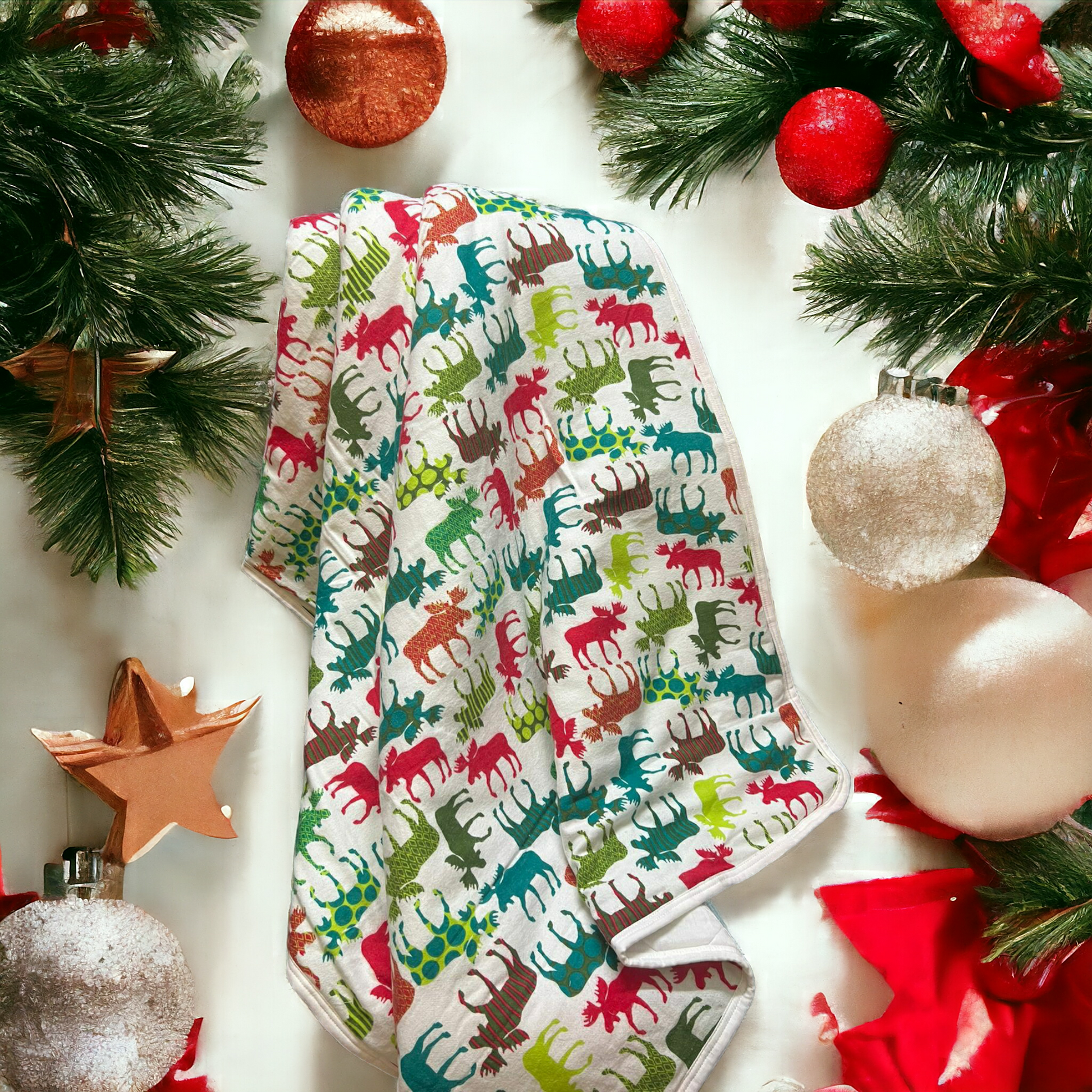 - Vibrant Reindeer Print: The blanket is adorned with a delightful variety of colorful reindeer, prancing across a wintery scene, perfect for sparking imagination and joy in your toddler’s room.